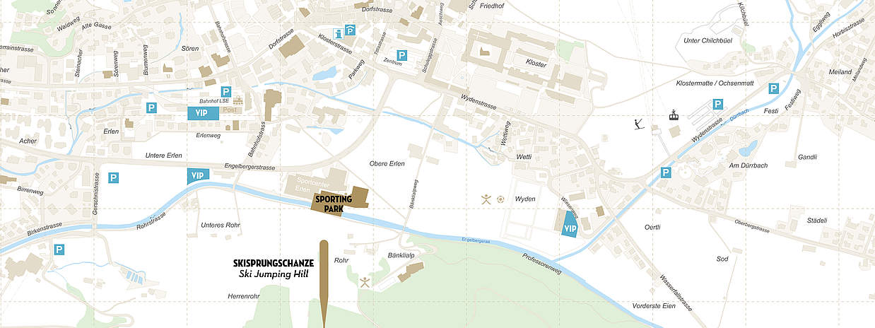 You can reach Engelberg easily by public transport: National and international connections (from Zurich Airport connections every half hour with a journey time of approx. 1 hour) take you to Lucerne. Then change trains and take the Zentralbahn railway up to Engelberg in 45 minutes through a varied landscape and gorges. The ski jump area is located very close to the railway station. If you follow the signs, you can reach the ski jump within two minutes on foot.